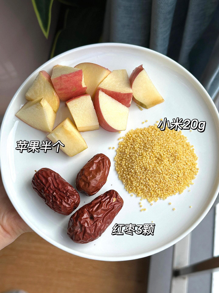 做法简单到笑:半个苹果(懒得削皮也行),三四颗红枣(记得去核),抓一小把小米,